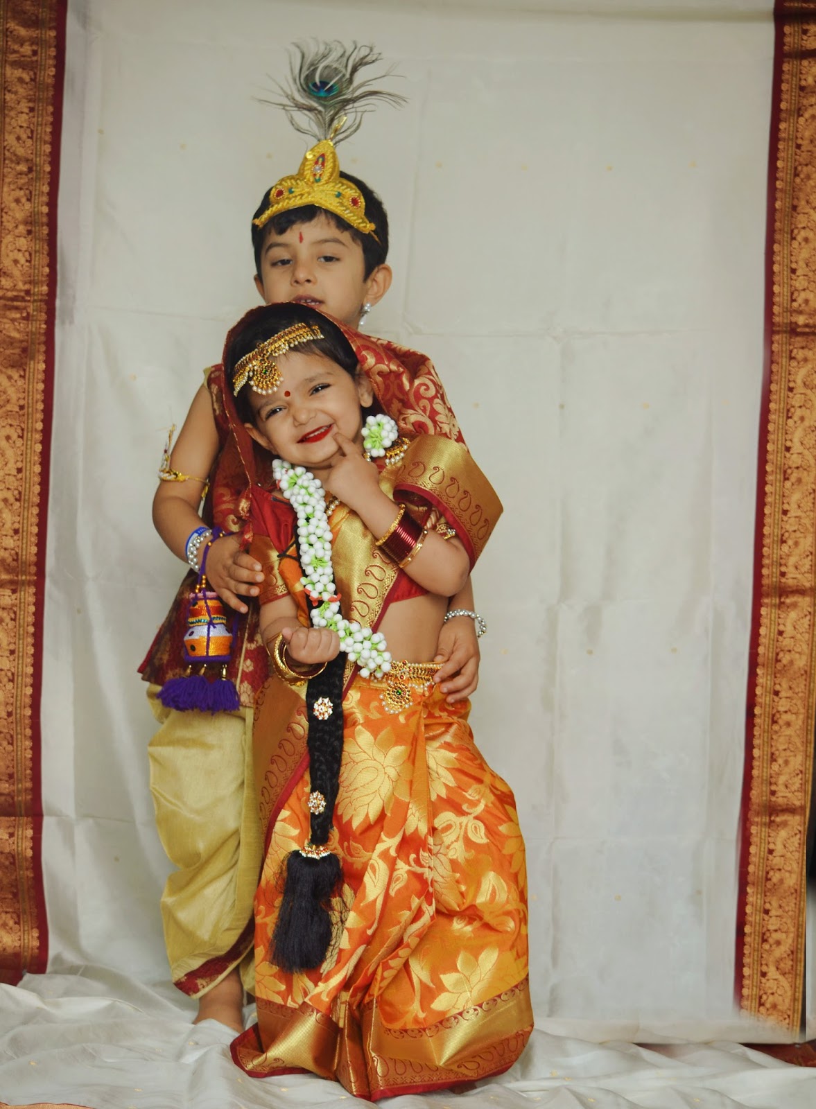 It wasn't too long ago when we celebrated Lord Krishna's birthday with these two being tiny. I still remember the first time we dressed them up two years ago, they had no idea what was happening and to get these two in sync seemed like a HUGE task. Look at them now... not just that they loved getting dressed up but they actually got into the real act of playing their characters. These are probably the cutest pictures that my camera ever clicked!!